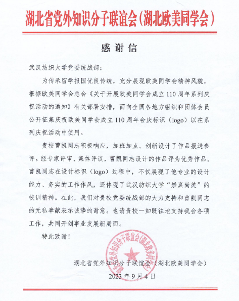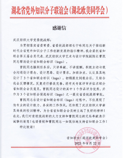 省知联会(湖北欧美同学会)在感谢信中对学校统战部的大力支持和曹凯的无私奉献表示诚挚的谢意,并充分肯定了曹凯在设计过程中不仅展现了他专业的设计能力、务实的工作作风,还体现了武汉纺织大学崇真尚美的校训精神,为全省知联会(欧美同学会)会员树立起了良好的榜样。