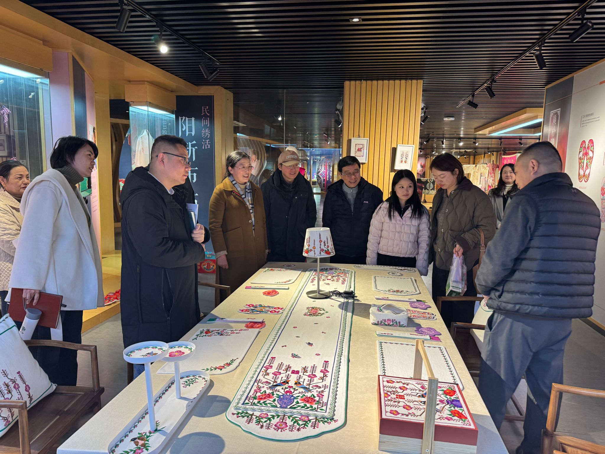 座谈会结束后,参会人员共同参观了学校纺织非遗馆。在讲解员的引导下,大家近距离观赏了汉绣等纺织非遗精品,详细了解了非遗文化的传承创新历程及学校在非遗保护、文化传承方面的重要成果。