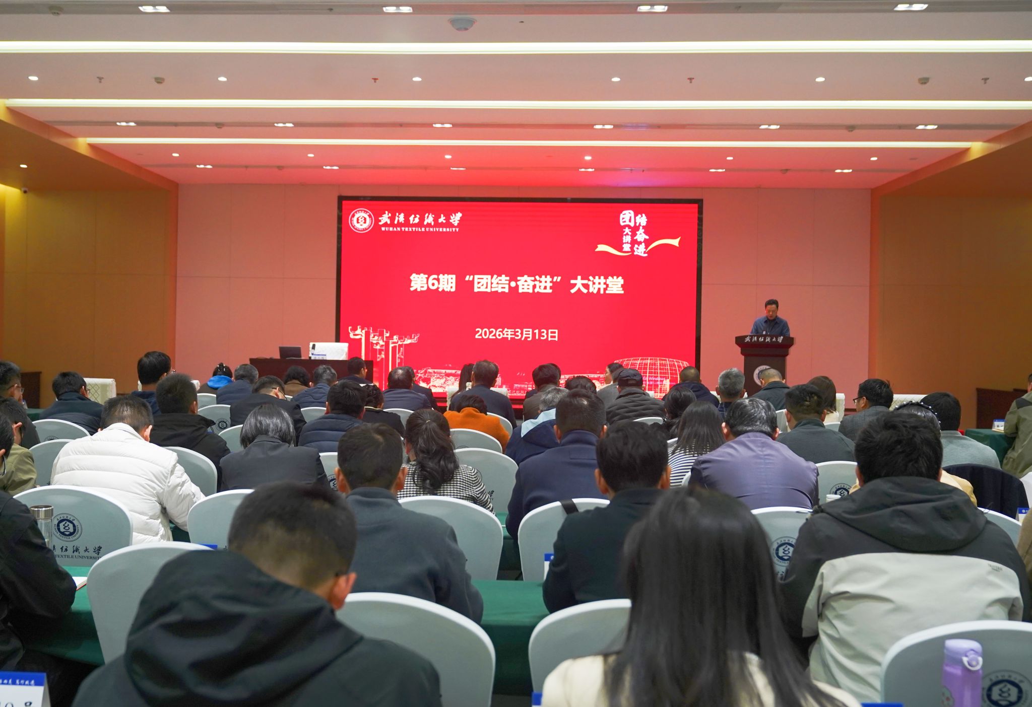 为进一步提升学校党务干部统一战线和民族宗教工作政策水平与实务能力,筑牢校园意识形态安全防线,3 月 13 日下午,武汉纺织大学第六期 “团结・奋进” 大讲堂暨党务干部培训会在阳光校区建全会堂全棉时代厅顺利举行。本次培训特别邀请湖北省委教育工委组织处二级调研员、“湖北省民族团结进步先进个人” 陈三鸿作《新时代抵御和防范宗教向高校渗透工作的使命与实践》主题报告。校党委常委、纪委书记程碧海主持会议并讲话,学校统一战线工作领导小组成员单位负责人、各二级院部党委书记、副书记及院办主任、学工办主任参加培训。
