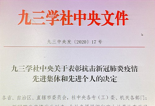 近日,九三学社纺织大学委员会收到一份表彰文件,学校校医院毛珺医生,九三学社省委青年工作委员会委员,荣获九三学社中央抗击疫情先进个人荣誉称号。
