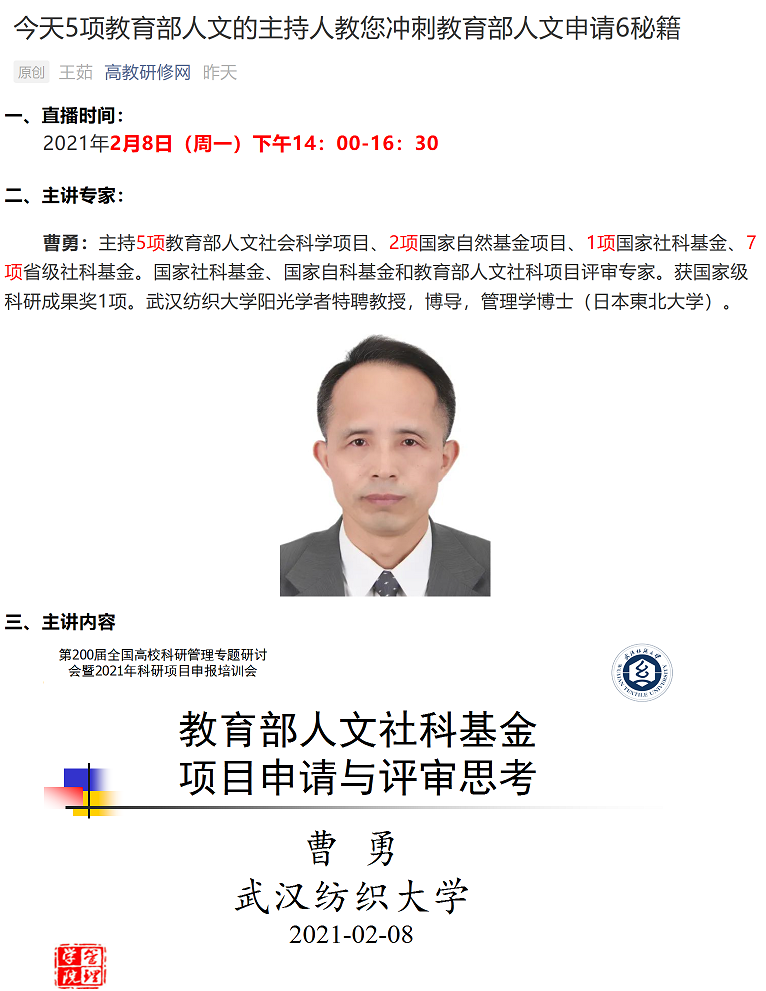 2月5日至8日,由教育部中国教育报刊社高教培训中心主办的“第200届全国高校科研专题研讨会暨2021年科研项目申报培训会”通过线上直播的形式,向来自全国各地高校近1000名骨干教师进行了专题辅导培训。8日下午,bevictor伟德官网管理学院曹勇教授应邀做客“高教研修直播间”,为全国高校冲刺教育部人文社科项目的青年教师们问诊把脉开方。