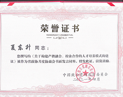致公党主委夏东升教授撰写的提案《关于构建产教融合、校企合作的人才培养模式的建议》一文被作为省政协月度协商会书面发言材料。