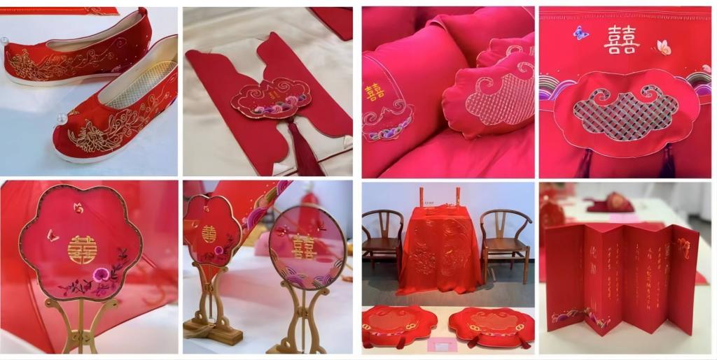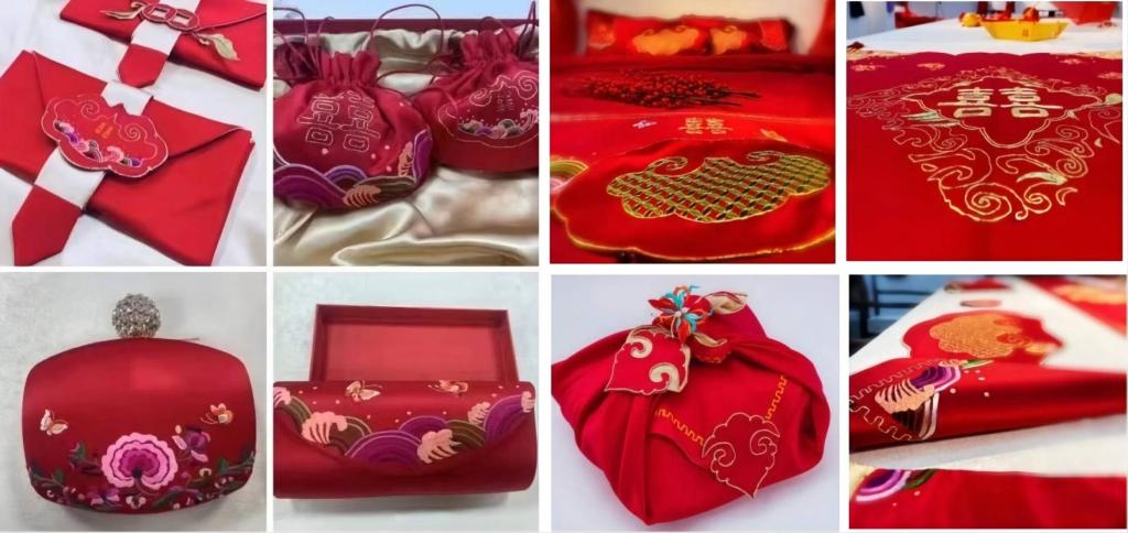 作品创作实践过程中,选择了与传统民俗礼仪密切相关的婚嫁主题,由纺大非遗教师团队指导设计方案,汉绣传承人张先松和姜成国老师指导绣稿图案及技艺实践,在坚持保护和传承的基础上,发扬传统工艺,开展融合创新,将汉绣、缠花、布贴等多个技艺相结合,最终由学员与高校师生共同创作完成“爱如潮水”婚庆系列汉绣文创作品绣制与制作。该系列作品汲取汉绣戏剧服装中常见海水江崖纹为主体装饰图案,搭配富有美好爱情祝福寓意的龙凤、蝴蝶、双喜、牡丹、如意、铜钱等纹样,表达新一代年轻人对婚姻的美好憧憬。整套作品共计89件(套),包括新郎新娘婚嫁礼服,床上用品,新娘盖头,婚鞋、婚书、头饰等各类婚嫁用品50多个品种,实现了传统刺绣工艺与现代时尚的有机融合。