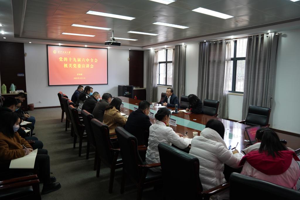 1月11日下午,机关党委在行政楼112会议室举行十九届六中全会精神宣讲报告会。学校十九届六中全会精神宣讲团成员,校党委副书记黄国辅作宣讲报告,机关党委全体委员、党委组织部、bevictor伟德官网、工会和人事处党员代表参加了报告会。报告会由校党委常委、党委组织部部长、机关党委书记金艳主持。