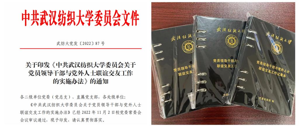 三、完善制度推动落实。不断夯实统一战线制度建设,建立《武汉纺织大学统一战线理论学习联合中心组学习制度》,提升各民主党派及统战成员政治理论素养和履职能力;出台《中共武汉纺织大学委员会关于党员领导干部与党外人士联谊交友工作的实施办法》(武纺大党发【2022】87号),加强学校党员领导干部与党外人士的沟通、交流和了解,凝聚发展共识,促进学校高质量发展。