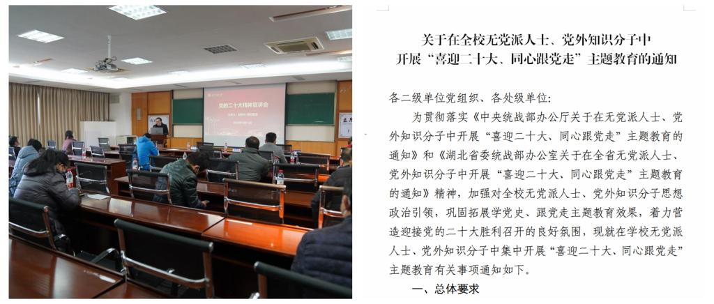 一、深入学习党的二十大精神。按照中央、湖北省和学校的统一部署,组织学校民主党派、统战团体、党外知识分子集中收看收听党的二十大开幕会,第一时间学习党的二十大报告,上报党的二十大学习心得百字谈;邀请傅欣副校长在民主人士中开展二十大精神宣讲,下发《关于在全校无党派人士、党外知识分子中开展“喜迎二十大、同心跟党走”主题教育的通知》,围绕主题深入开展学习讨论,团结引导统一战线成员不断增进对中国共产党和中国特色社会主义的政治认同、思想认同、理论认同和情感认同。