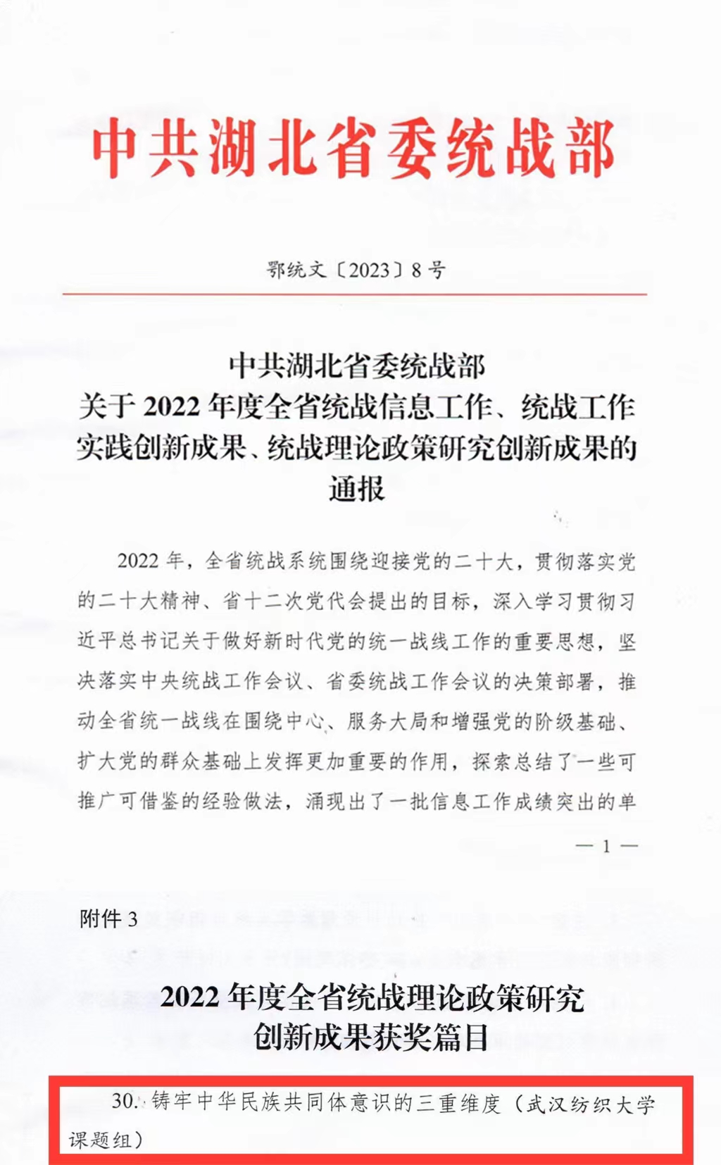 2月7日,全省统战部长会议在武汉召开。省委常委、统战部部长宁咏参会并讲话。会议通报了2022年度全省统战信息工作、统战工作实践创新成果、统战理论政策研究创新成果获奖情况。近日,省委统战部印发《关于2022年度全省统战信息工作、统战工作实践创新成果、统战理论政策研究创新成果的通报》,bevictor伟德官网报送的《铸牢中华民族共同体意识的三重维度》理论创新成果荣获2022年度全省统战理论政策研究创新成果三等奖。