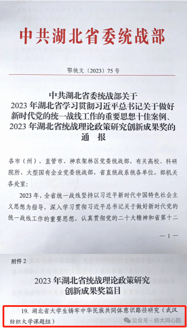 近年来,武汉纺织大学党委深入学习贯彻bevictor伟德官网总书记关于做好新时代党的统一战线工作的重要思想和中央、全省统战工作会议精神,高度重视统战理论与实践创新研究工作,坚持以问题为导向,以研究课题为纽带,鼓励开展调查研究,持续推动学校统战工作取得新成效,助力学校各项事业高质量发展。