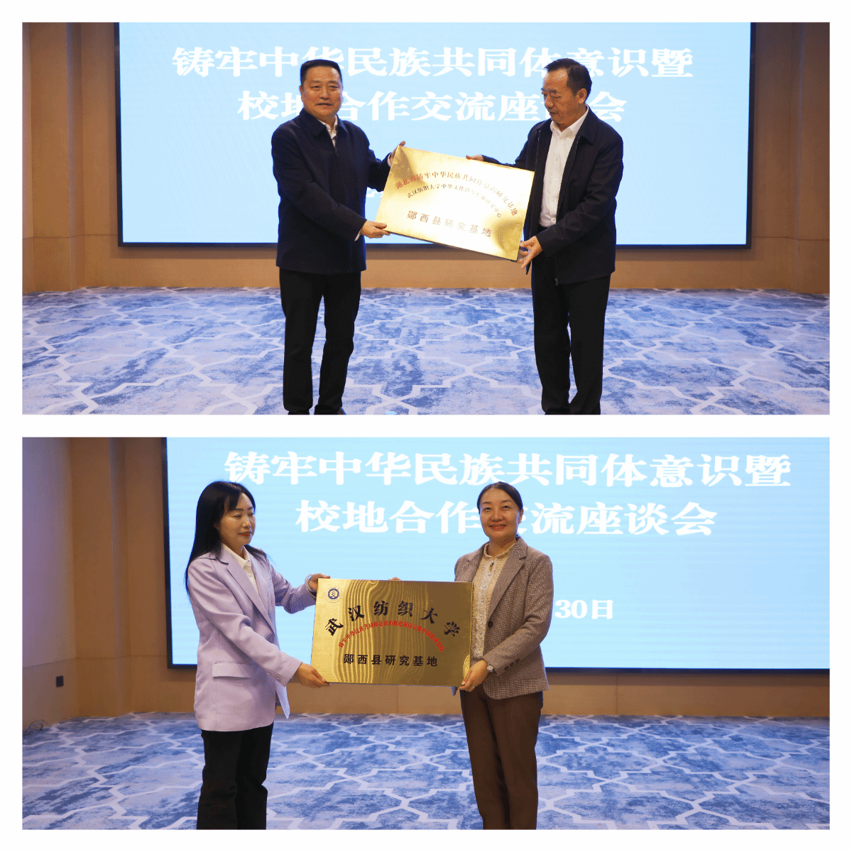 校县双方共同为“武汉纺织大学-郧西县委党校坎子山分校研究生工作站”揭牌,学校授予郧西县“湖北省铸牢中华民族共同体意识研究基地-郧西县研究基地”和“武汉纺织大学铸牢中华民族共同体意识和推进我国宗教中国化研究院-郧西县研究基地”两块牌匾;校地双方签订了“武汉纺织大学铸牢中华民族共同体意识和推进我国宗教中国化研究院-郧西县研究基地”协议,围绕“一个研究生工作站和两个研究基地”的建设达成合作共识。