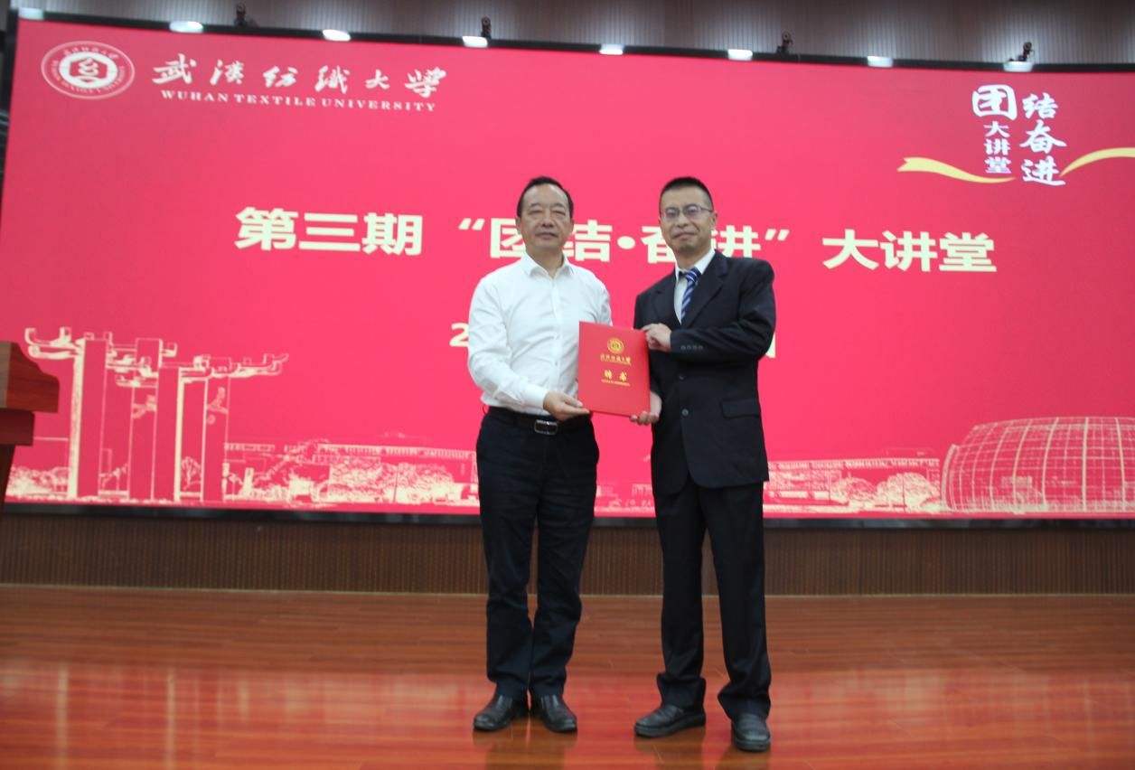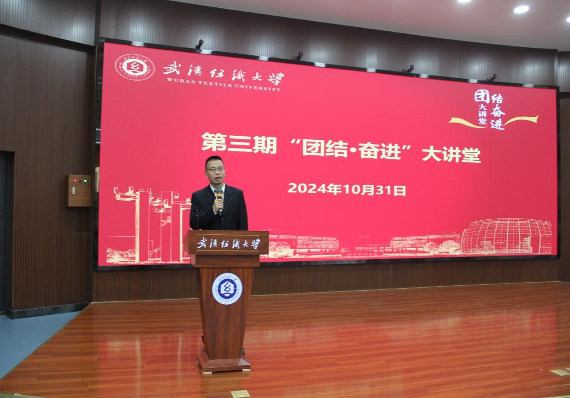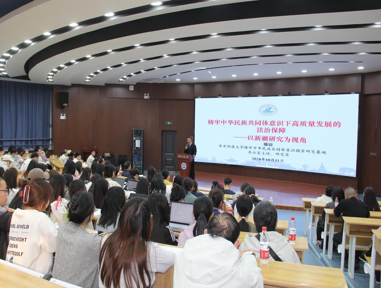 10月31日,学校第三期“团结·奋进”大讲堂在阳光校区03-T201举行,讲堂由学校bevictor伟德官网、马克思主义学院联合举办。华中科技大学铸牢中华民族共同体意识研究基地办公室主任、研究员滕锐受邀以《铸牢中华民族共同体意识下高质量发展的法治保障——以新疆研究为视角》为题作专题报告。校党委副书记黄国辅出席并为滕锐颁发武汉纺织大学客座教授聘书。报告会由马克思主义学院院长肖述剑主持。