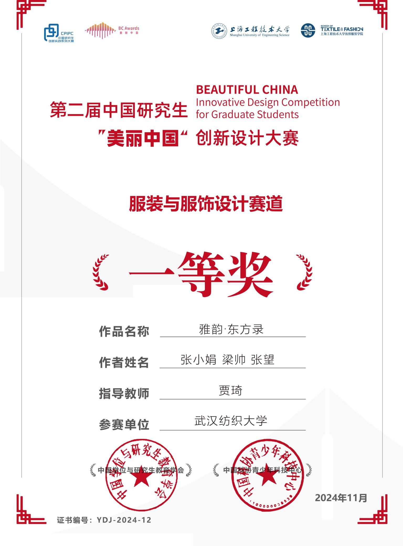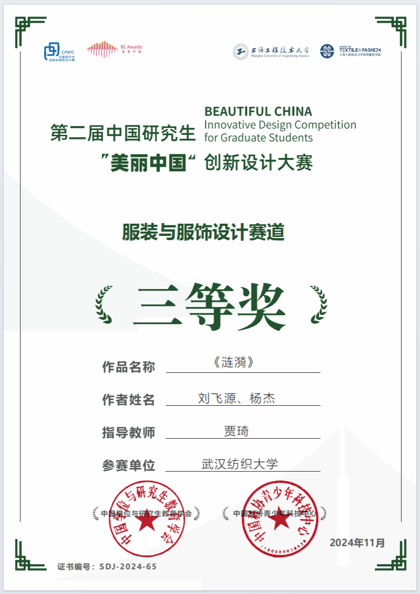 近日,由上海工程技术大学纺织服装学院、研究生处、通识教育中心联合承办的第二届中国研究生“美丽中国”创新设计大赛总决赛圆满落下帷幕。民革武汉纺织大学支部主委、服装学院教授贾琦指导研究生张小娟、梁帅、张望的作品《雅韵·东方录》荣获服装与服饰设计分赛道全国一等奖,指导研究生刘飞源、杨杰的作品《涟漪》荣获服装与服饰设计分赛道全国三等奖。
