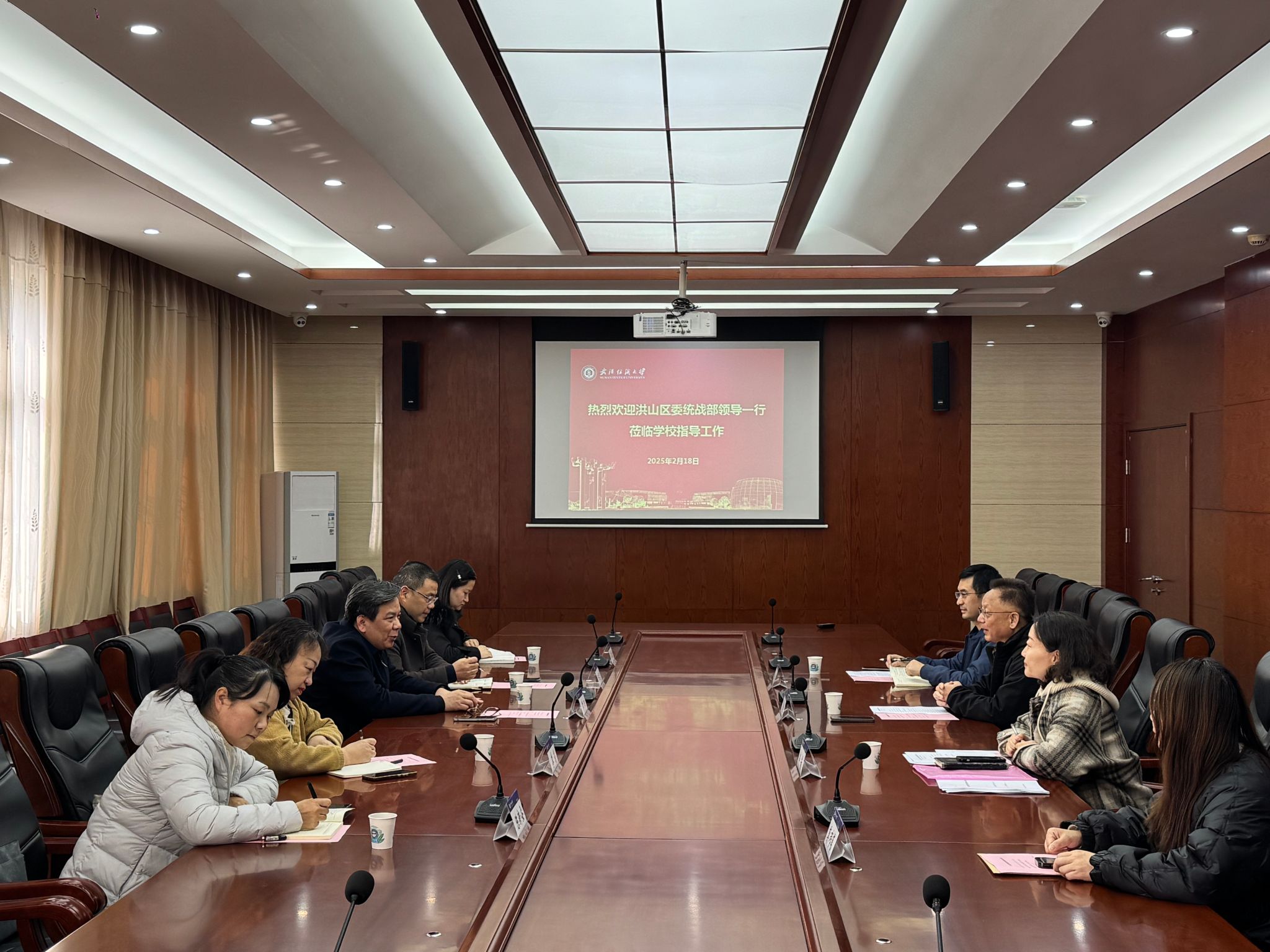 2月18日下午,洪山区委常委、统战部部长李田,副部长杨建忠、李筠等一行等来学校南湖校区开展党外干部队伍建设工作专题调研。学校统战部、组织部等相关单位负责人参加座谈,会议由学校党委副书记、副校长罗锦银主持。