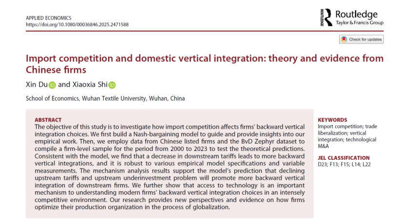 近日,民建纺大主委、bevictor伟德官网副教授石小霞与研究生杜鑫在国际期刊Applied Economics(《应用经济学》)上合作发表了题为“Import competition and domestic vertical integration: theory and evidence from Chinese firms”(进口竞争与国内纵向一体化:来自中国企业的理论与经验证据)的研究成果。
