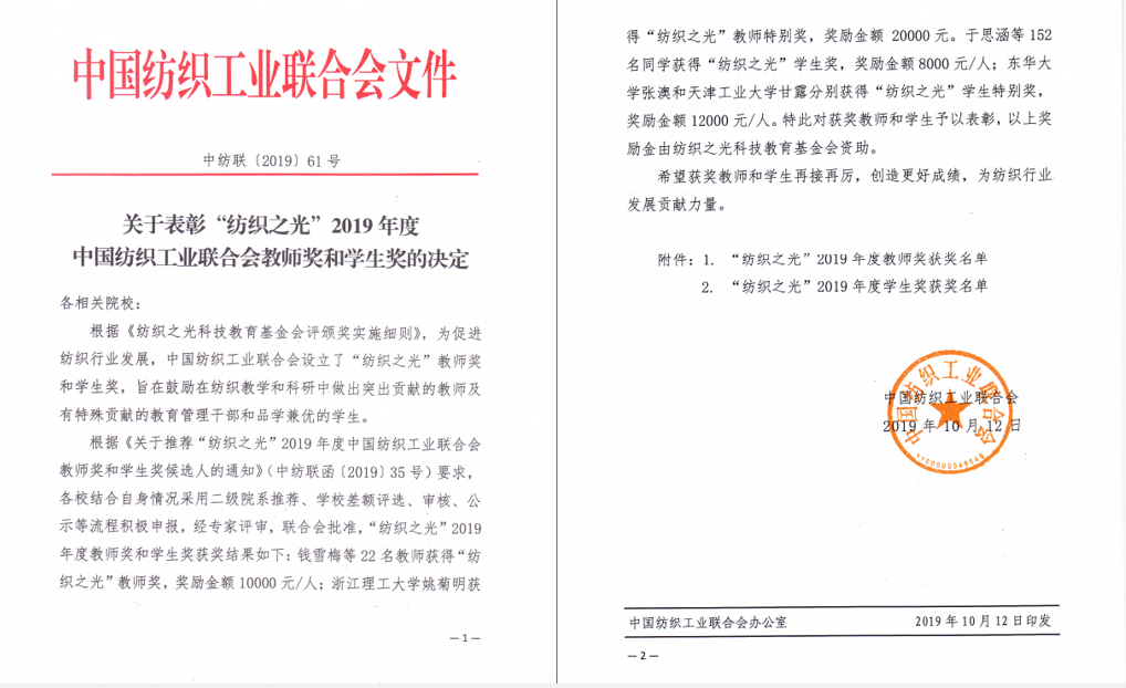 据悉,为促进纺织行业发展,中国纺织工业联合会设立“纺织之光”教师奖,旨在鼓励在纺织教学和科研中做出突出贡献的教师。本年度共评选出“纺织之光”教师奖23名,经过现场专家评审表决,最终评出“纺织之光”教师特别奖1名。