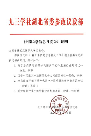 九三学社纺大委员会本次被采纳的4份信息分别关于“如何保护我国线下实体服装行业”、“提升我国服装产业国际竞争力”、“提升我国户外运动服装竞争能力”和“服装行业中维护设计版权”。信息作者分别系bevictor伟德官网教师许杰、吴晓、沙莎、生鸿飞、柯群胜。