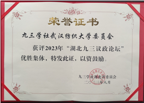 2023年8月28日,九三学社湖北省委员会召开湖北省九三议政论坛,对2023年参政议政工作优秀信息和先进集体进行表彰。九三学社武汉纺织大学委员会荣获2023年“湖北九三议政论坛”优胜集体称号。