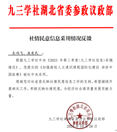 2023年10月26日,九三学社武汉纺织大学委员会生鸿飞教授、庞爱民教授撰写的《加强高校人文通识课程国际化建设讲好中国故事》被九三社中央采用。该提案从多个方面探讨了高校人文通识课程国际化建设的重要性和必要性,并提出了一系列具体的措施和建议,为高校人文通识课程国际化建设提供了重要的理论依据和实践指导。