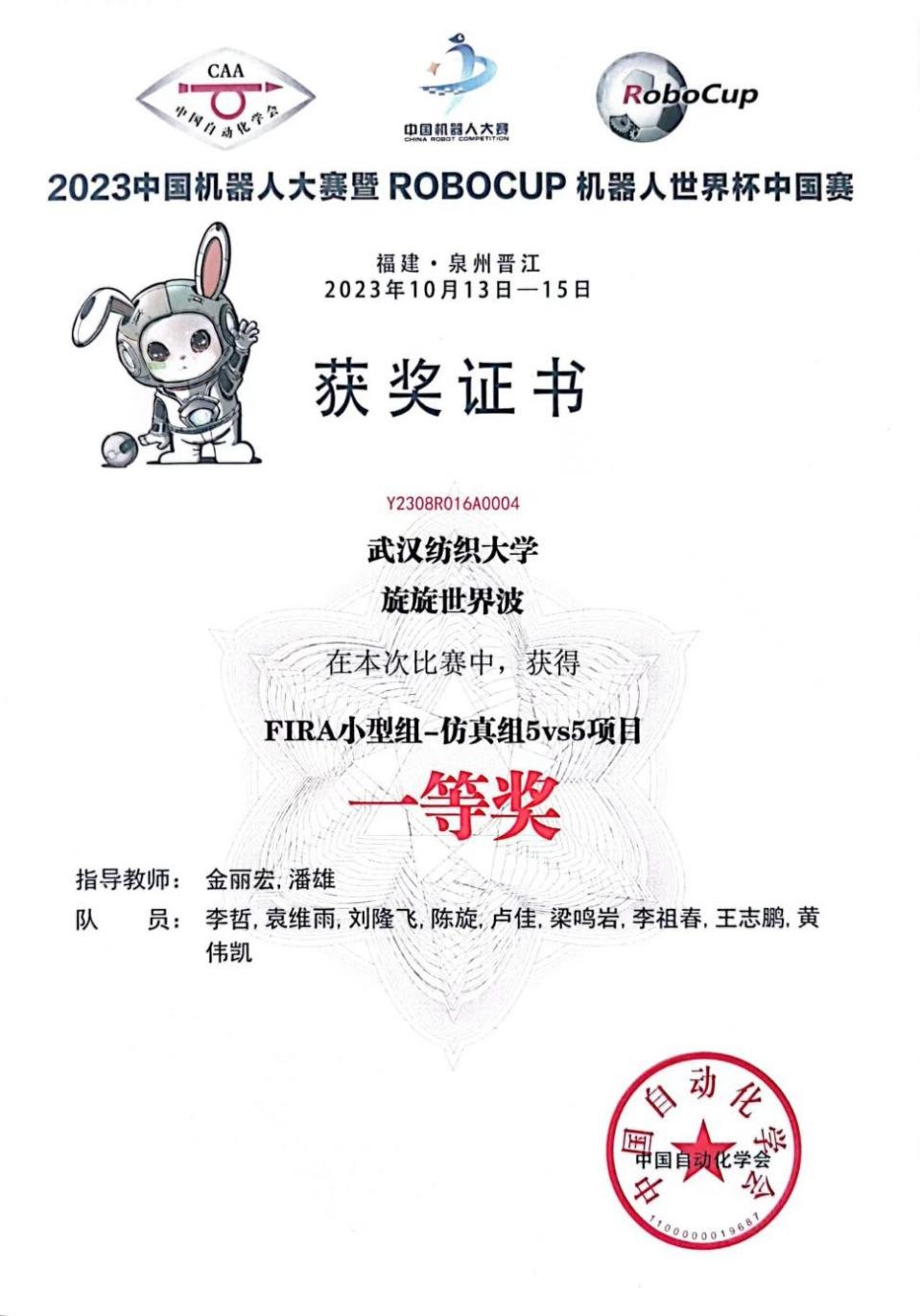 近日,2023年中国机器人大赛暨Robocup机器人世界杯中国赛在福建晋江国际会展中心落下帷幕。第23届中国机器人大赛自今年10月开赛以来,吸引了包括清华大学、同济大学、华中科技大学等260所学校的1084支队伍参加,高校参赛队伍数量及报名人数均创大赛历史之最。由九三学社武汉纺织大学委员会、数理学院金丽宏副教授和计算机与人工智能学院潘雄教授指导的学生团队“旋旋世界波”战队一路过关斩将,从小组赛中杀出重围,在FIRA5vs5机器人仿真组中获得全国一等奖,实现了bevictor伟德官网在该项赛事中的新突破。