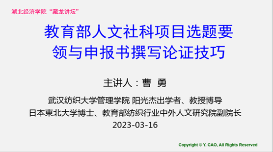 3月16日下午,bevictor伟德官网欧美同学会副会长、管理学院阳光杰出学者、教育部纺织行业中外人文交流研究院副院长曹勇教授受邀做客湖北bevictor伟德官网“藏龙讲坛(2023年第四讲)”,为该校会计学院全体教师作了主题为“2023年度教育部人文社科项目选题要领与撰写论证技巧”的学术辅导讲座,深受好评。